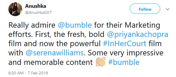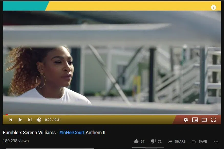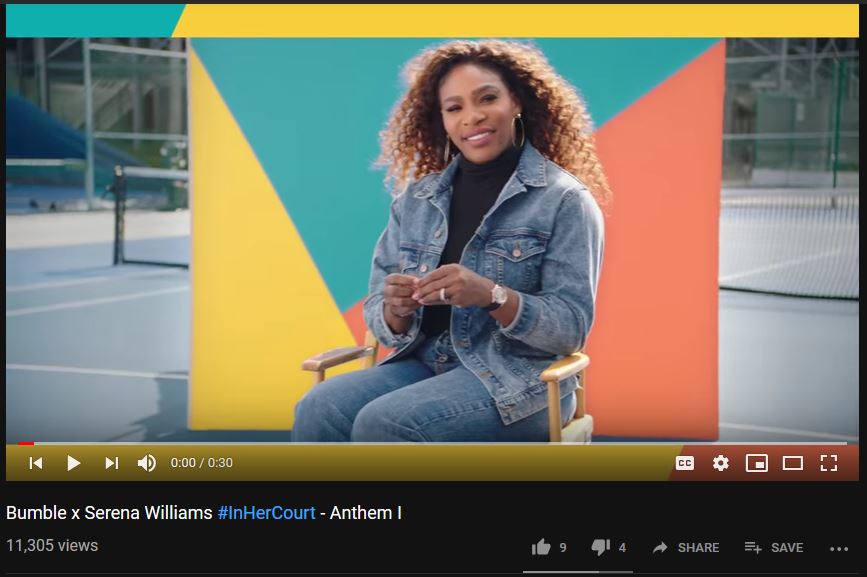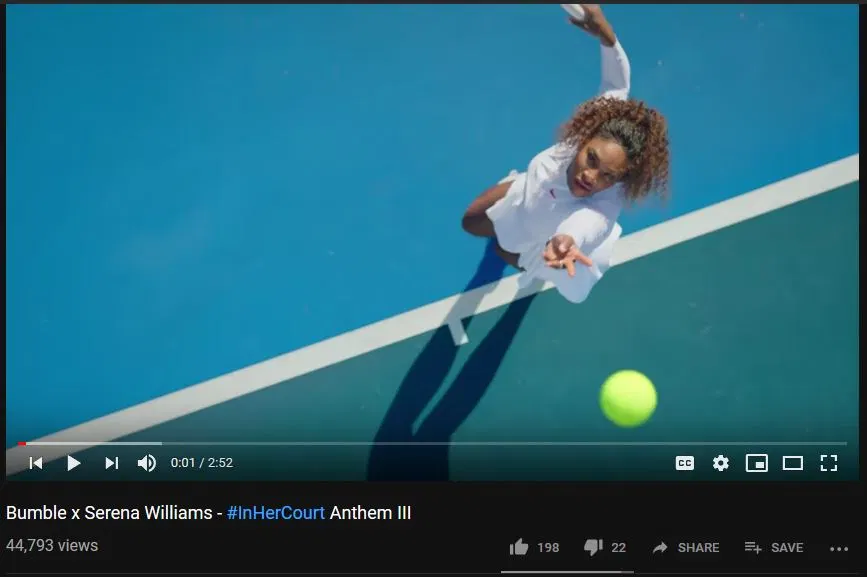 Starting on Facebook, the Bumble team announced the upcoming partnership with Williams through an interview styled video. The announcement via Twitter by Bumble Founder Whitney Wolfe Herd, initially received the most interaction and was the only post that did not contain a video filmed by the advertising team. Shortly following, teaser videos as well as various inspirational videos utilizing the #InHerCourt message spread on YouTube, Instagram and Twitter. The content shared by Bumble for this campaign stuck to various videos and the #InHerCourt hashtag created by their female forward team. With little information on what the company’s hashtag meant the videos gained thousands of interactions solely for its overall message after the nationally televised release.