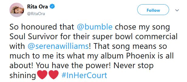 Twitter – By far the most successful of the social media marketing only tweeted twice about the campaign. On the third of February with an announcement from CEO and founder Whitney Wolfe-Herd, sharing the campaign and influencer the company would be working with. The next, as well as last tweet about the campaign was on February 3rd just after the national release. Various other companies including VMLY&R the advertising agency used for the campaign, celebrities, and everyday users used the #InHerCourt hashtag to share the intended message. After the commercial release the hashtag was used to share links to the Super Bowl commercial, articles, Bumbles YouTube channel, and to share user’s responses and stories related to the hashtag and commercial.