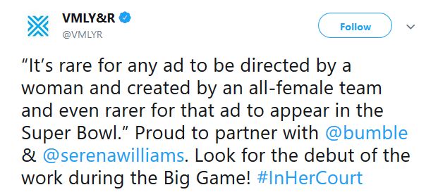 “Bumble and Serena Williams ‘Make The First Move’ During the Super Bowl.” VMLY&R, 31 Jan. 2019, www.vmlyr.com/news/bumble-and-serena-williams-make-first-move-during-super-bowl.