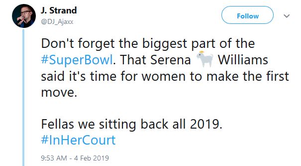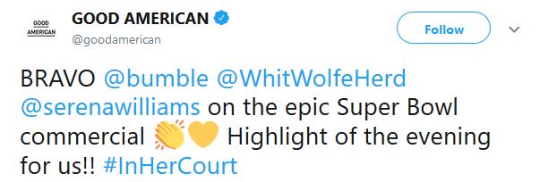 Bumble’s #InHerCourt campaign is not designed to sell a product but rather to sell a mindset. Being a self-proclaimed feminist dating app, they encourage women to own their power through work, relationships and friendships. Since the Super Bowl demographic is generally men Bumble took advantage of the growing female fan base to release their commercial. The message meant to inform the public about the brand and values also wants to remind its female viewers of how much power they hold. “If you seek to create impactful change, you must often make an impactful first move,” stated Wolfe Herd. “By sharing our message with a global audience of hundreds of millions, we are aiming to leverage this cultural moment widely considered to be male dominated and flip the narrative to show that no matter the playing field, we are here, and we have the power to be heard.” (Bumble). Partnering with Serena Williams, a highly respected powerful female athlete, provided an influencer that would reach multiple audiences and age ranges. “Serena Williams sets records. She crashes ceilings. She’s an elite athlete — the best of the best. A role model. An entrepreneur. An activist. A mother. She’s the first and the only. She’s always made the first move in her life, both on and off the tennis court” (In Her Court). Aligning with Bumbles values, Williams represents a strong woman who broke through the barriers as an athlete, mother, entrepreneur to represent Bumble’s message as a Global Ambassador.