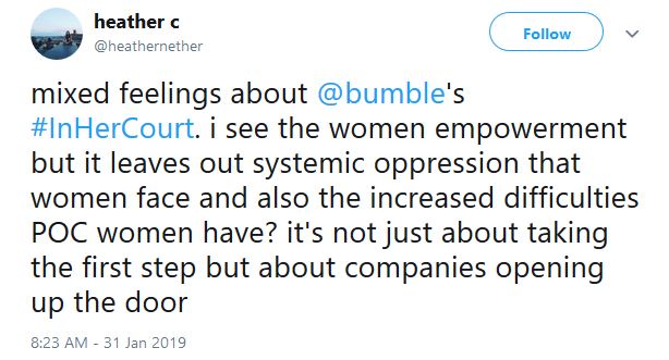 The campaign has died down since the initial release at the Super Bowl and interactions with the hashtag as well as video content have also seen a decrease. With a tactical marketing strategy Bumble was able to market their brand, mission and values successfully to their target audience. The campaign effectively provided its message by understanding their needs to achieve its goal. With content being shared on multiple social platforms it allowed the company to reach a wide age range and quickly respond to its audience. The call to action telling women “the ball is in your court” followed by the Bumble logos reminded the audience that the versatile app is a place for new connections and opportunities in their careers. Though the campaign seems to be short lived it brought attention to adversity and opportunity for all women to take action for what they want.
